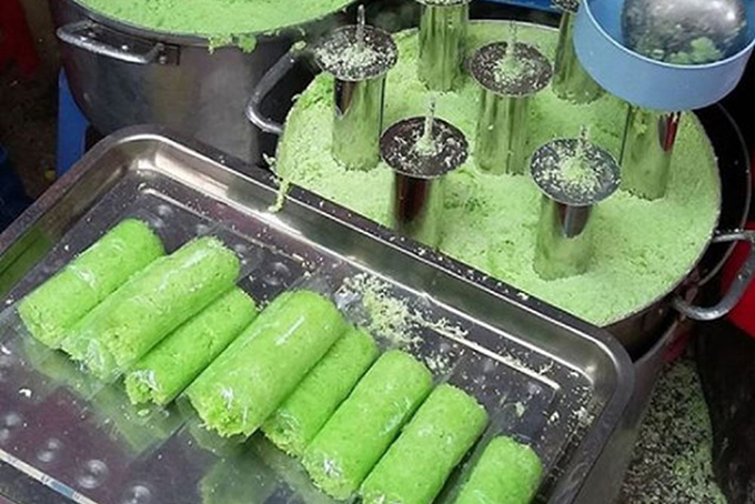 Bánh ống Sóc Trăng được hấp cách thủy trong ống tre hoặc ống nhôm nên gọi là bánh ống, chỉ khoảng 2 phút là xong mẻ bánh. Sắc xanh dịu mắt cùng chút vừng và lạc rắc lên trên, nhìn thôi cũng đã hấp dẫn quá chừng!