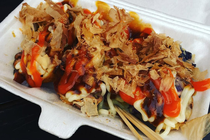 Một hộp bánh bạch tuộc Takoyaki trên đường phố