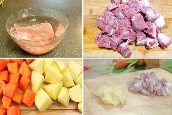 Bước 1: Bắt đầu bằng việc rửa sạch thịt bò và thái thành miếng vuông. Đun nước sôi trong một nồi và chần sơ qua thịt bò, sau đó vớt thịt ra và rửa sạch một lần nữa. Đây cũng là cách để làm giảm bớt tạp chất, mùi hôi của thịt bò.