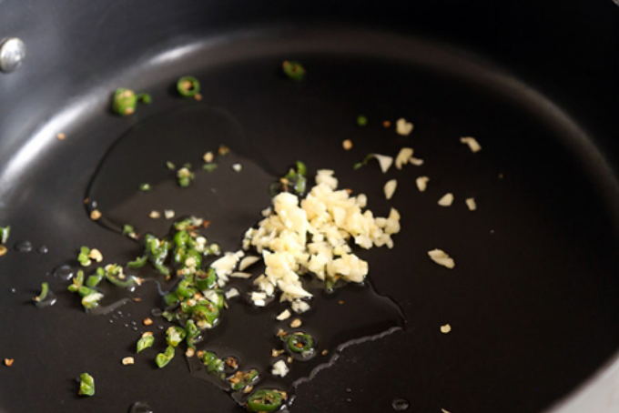 - Làm nóng chảo ở nhiệt độ cao với một chút dầu rồi cho tỏi, ớt băm nhỏ vào xào trong 1 phút.
