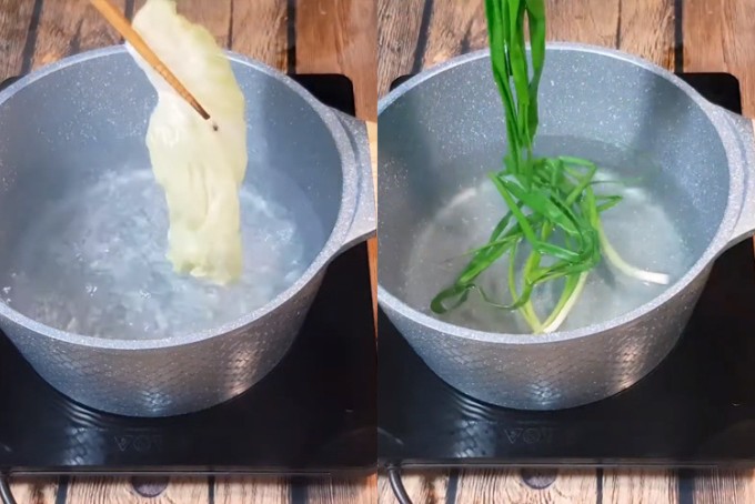 Tiếp theo bạn đun sôi một nồi nước, cho các lá bắp cải và hành vào chần cho chín tái, mềm để dễ cuốn thịt.