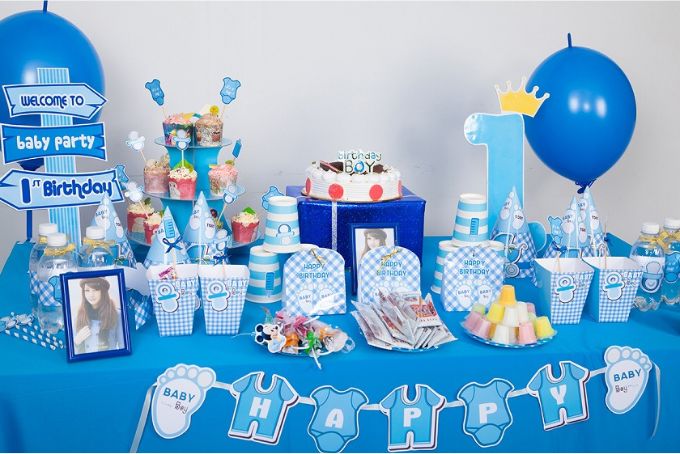 Khi trang trí sinh nhật cho bé trai, ba mẹ thường lựa chọn phong cách năng động, tinh nghịch với các tông màu nam tính như xanh dương, vàng, xanh lá cây, … Các họa tiết, hình ảnh cho buổi tiệc sinh nhật là ô tô, máy bay, rô bốt, tàu vũ trụ, đại dương,....
