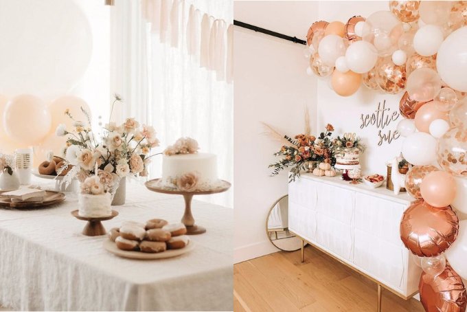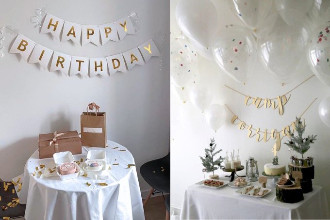 Không cần nhiều đèn, dây, chi tiết nhỏ, trang trí tối giản là chọn một tông màu chủ đạo, dùng vài phụ kiện trang trí sinh nhật như bóng, hoa tươi để làm điểm nhấn cho buổi tiệc.