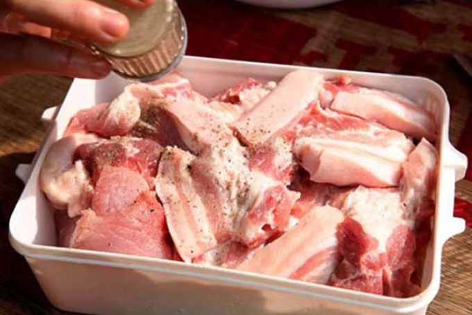 Rửa sạch thịt cùng với muối. Thái thịt gói bánh chưng thành từng miếng có độ dài khoảng 5 - 6cm và dày 1 - 2cm. Tiến hành ướp thịt cùng với hạt tiêu và muối.