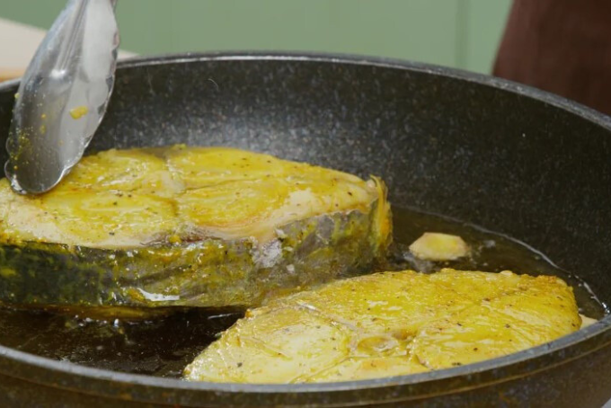 Chiên vàng 2 mặt cá với dầu nóng rồi ướp với gia vị