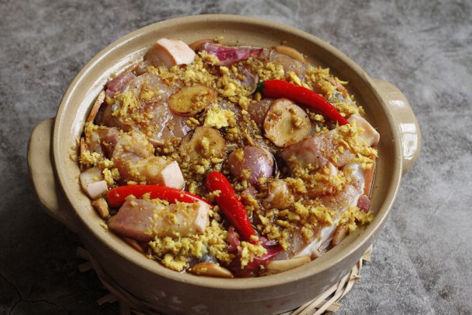 Cho cá và thịt vào nồi ướp với 2 muỗng nước mắm, 1/2 muỗng đường, 1/2 muỗng bột ngọt, tiêu, hành tím, ớt, riềng trong 30 phút cho thấm gia vị.