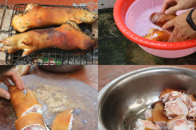 - Chân giò heo bóp muối hạt, nước cốt chanh, cạo sạch phần lông và phần đen ở kẽ móng. Sau đó rửa sạch, để ráo.
