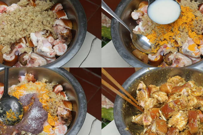 - Cho riềng cắt lát cùng 2/3 hành tỏi băm, 5 muỗng canh mắm tôm, 3 muỗng canh mẻ, 1 muỗng canh bột nghệ, 5 muỗng canh đường, 1 muỗng canh bột ngọt vào thau rồi trộn đều và ướp khoảng 30 phút cho chân giò thấm gia vị.