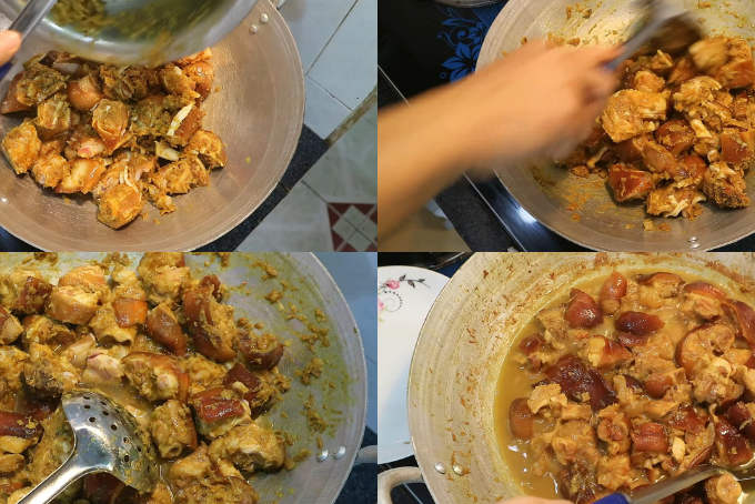 Lưu ý: Có thể cho tiết lợn vào để tạo màu và tăng thêm hương vị đặc trưng, hấp dẫn của thịt giả cầy- Cho 1 thìa canh dầu ăn vào nồi, làm nóng dầu thì phi thơm nốt số riềng xay. Sau đó cho giò heo và thịt chân giò đã ướp vào xào.