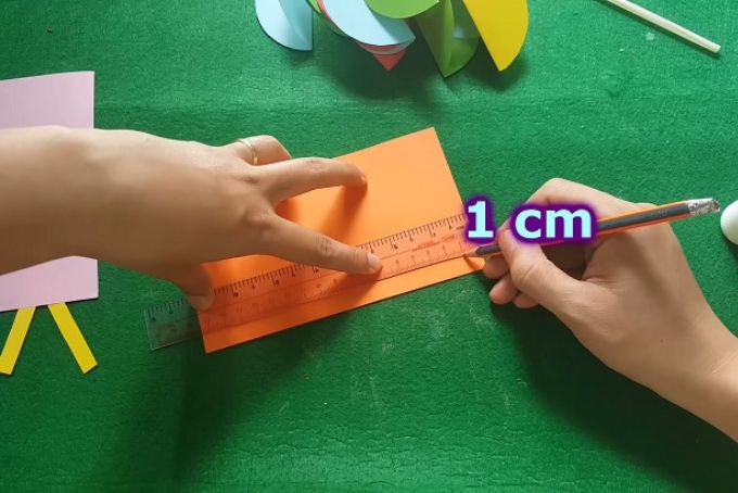Bước 2: Tiếp đến, bạn dùng kéo cắt một mẩu giấy A4 hình chữ nhật có kích thước 17.5 cm x 10cm (hoặc kích thước lớn hơn nếu số lượng hình tròn nhiều hơn 16 hình), dùng bút chia thành những vạch nhỏ đều nhau trên góc mặt giấy đó.