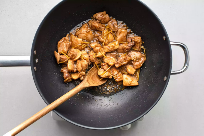 Tiếp tục xào theo cách này cho đến khi hết nước sốt, gà và nấm chín, khoảng 4 đến 5 phút.