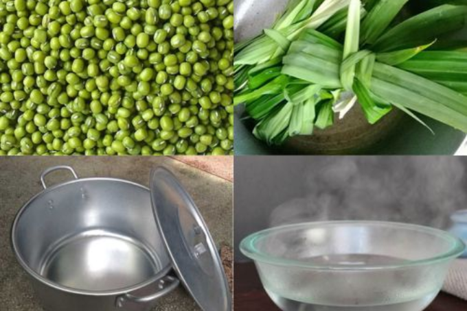 Bước 1: Sơ chế đậu xanh bằng cách loại bỏ hạt đậu hỏng và lép. Sau đó, rửa nhẹ đậu xanh 2-3 lần dưới vòi nước để loại bỏ bụi bẩn. Hòa nước ấm theo tỷ lệ 2 phần sôi và 3 phần lạnh. Đổ đậu xanh vào tô nước và ngâm trong 6-8 tiếng để vỏ đậu xanh mềm, hạt đậu hút nước. Sau đó, vớt đậu xanh lên và xả dưới vòi nước nhẹ. Để đậu xanh khô ráo, sau đó rửa sạch từng lá dứa dưới vòi nước sạch.