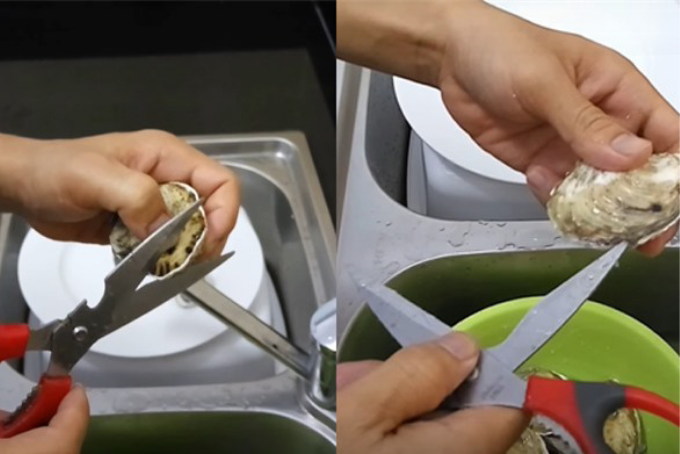 - Dùng 1 con dao nhọn lách vào miệng hàu rồi tách đôi ra. Rửa hàu đã tách đôi ra bằng chút nước muối pha loãng rồi để ráo nước.