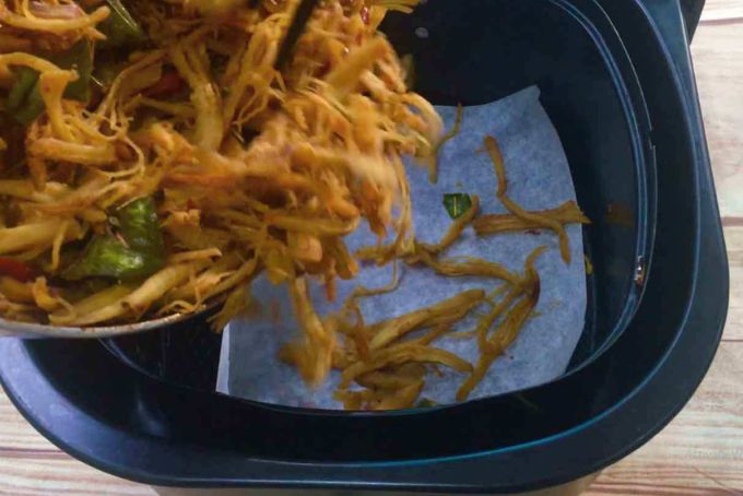 Cho khô gà lá chanh vào nồi chiên không dầu