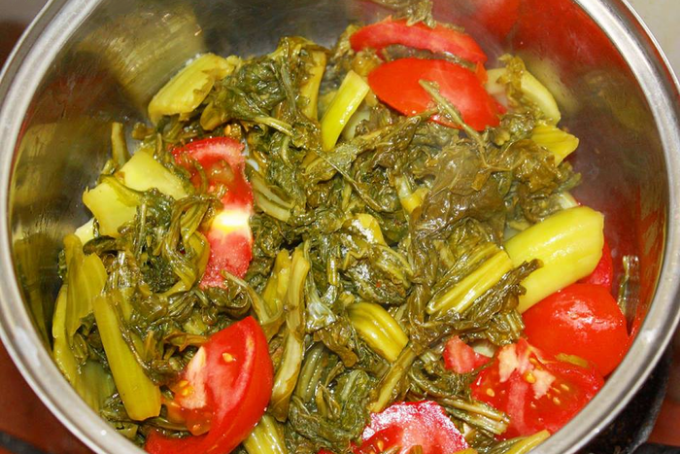Bước 1: Dưa chua sau khi mua về rửa qua với nước lạnh vắt hết nước cho ráo để tránh vị quá chua của dưa. Cà chua bổ múi cau cho vào nồi xào lên cùng với dưa chua (khoảng tầm 3 - 4 phút).