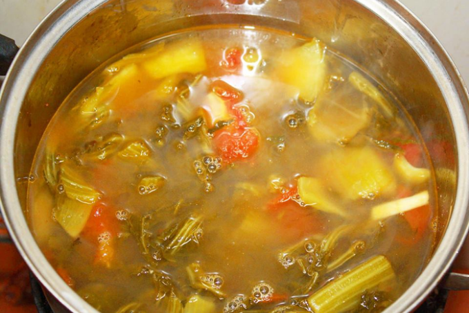 Cho cá đã chiên vào nồi canh đang đun sôi