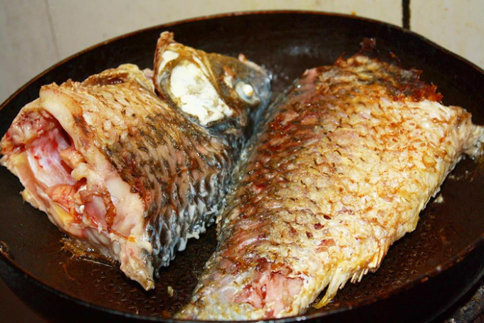 Chiên đều 2 mặt cá chép khoảng 6- 8 phút cho đến khi phần da cá hơi xém vàng thì cho ra đĩa.