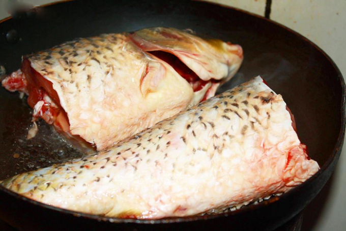 Bước 3: Trong thời gian đợi canh sôi tiếp tục sơ chế cá chép. Cá chép rửa sạch, cắt đôi ra và cho lên chảo dầu đang nóng để chiên. Việc chiên qua cá để tránh vị canh có mùi tanh và còn giúp thịt cá trở lên săn chắc hơn.