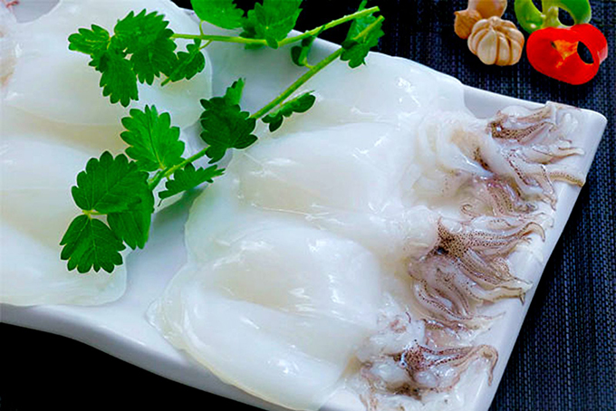 Mực ống: Chọn những con có lớp thịt màu sáng hơi hồng, đầu vẫn dính chặt vào thân, phần râu mực cứng, túi mực chưa bị vỡ.