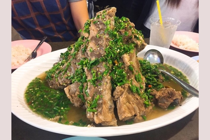 Những tảng sườn được xếp chồng lên nhau trên đĩa, sau đó rưới sốt. Nước sốt từ nước hầm xương, vị hơi chua, tương tự tom yum, nhưng đậm đà hơn. Ớt xanh cay nồng có thể khiến bạn nhăn mặt trong lần đầu nếm thử, nhưng sẽ dễ quen và thấy thích thú đấy.