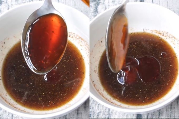 Nước sốt sẽ được pha với 2 thìa giấm, nửa thìa đường, 2 thìa tương cà, nửa thìa nước tương. Tiếp theo cho thêm vào nửa thìa hạt nêm và 3 thìa nước lọc. Khuấy đều hỗn hợp cho chúng hòa tan lại với nhau.
