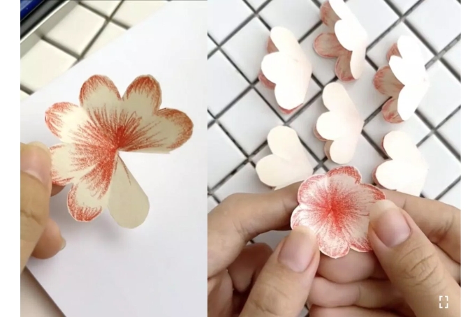 Bước 5: Sau khi đã vẽ xong, bạn dùng kéo cắt theo đường vừa vẽ. Như vậy ta đã có hình dạng một bông hoa. Theo đó, bạn hãy dùng bút màu tô đường viền bên ngoài. Lưu ý là dùng màu tương đồng để vẽ lên nhé.