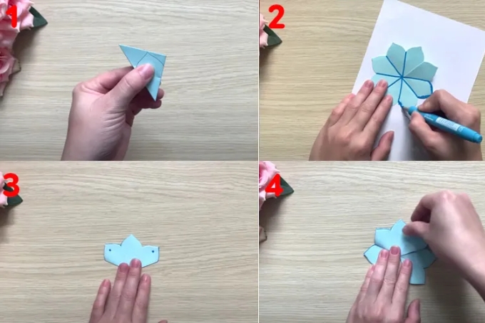 Bước 4: Tiếp theo chúng ta sẽ đến bước tạo hoa 3D ở bên trong thiệp. Bạn cắt tờ bìa hình vuông và xếp chúng thành hình tam giác như hình dưới. Sau đó ta dùng bút chì kẻ một đường hình dạng cánh hoa, bạn có thể quan sát hình vẽ bên dưới.