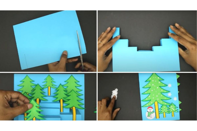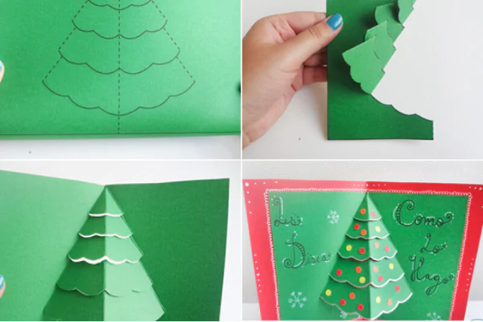 Để trang trí thêm cho tấm thiệp của mình, bạn có thể vẽ và cắt riêng những cây thông Noel, người tuyết, ông già Noel,... ở ngoài rồi sau đó dán lên các tầng bên trong thiệp 3D vừa tạo ở 2 bước trên.