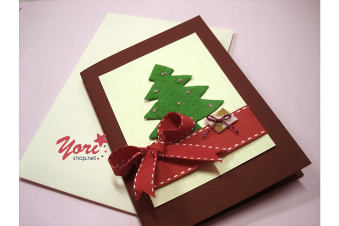 Bước 6: Gập đôi tờ bìa còn lại và dán chồng tờ bìa có cây thông lên trên sao cho các đường trục gấp của 2 tờ giấy trùng và chính xác lên nhau.