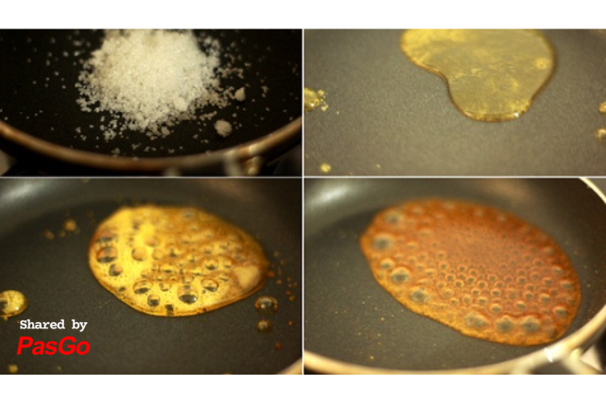 - Đầu tiên bạn thắng nước đường bằng cách cho 1 thìa canh dầu ăn và 2 thìa canh đường vào chảo. Thắng nước màu ở nhiệt độ thấp, đủ để đường tan chảy.