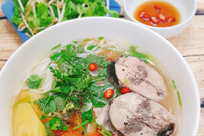 - Xếp bún vào tô, sau đó, chan nước dùng có cả cà chua, hành tím, thơm. Tiếp đến là cho chả cá đã hấp, chả cá chiên thái lên trên, cho thêm chút hành tươi, hành chẻ, tỏi phi thơm và ăn cùng rau sống.