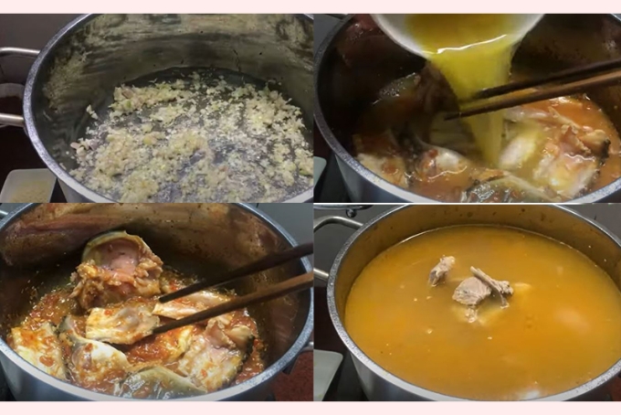 - Phi thơm 1 muỗng canh dầu ăn- 1 muỗng canh sả băm- 1 muỗng canh tỏi băm- 1 muỗng canh hành tím băm- 3 trái ớt đập dập, vớt ra chén, cho sả cắt khúc đập dập vài xào sơ, thêm 1 lít nước dừa, 500ml nước ép, 1lít nước lọc, xương cá. Đun sôi hạ bớt lửa, ninh tầm 30phút, vớt bỏ xương.