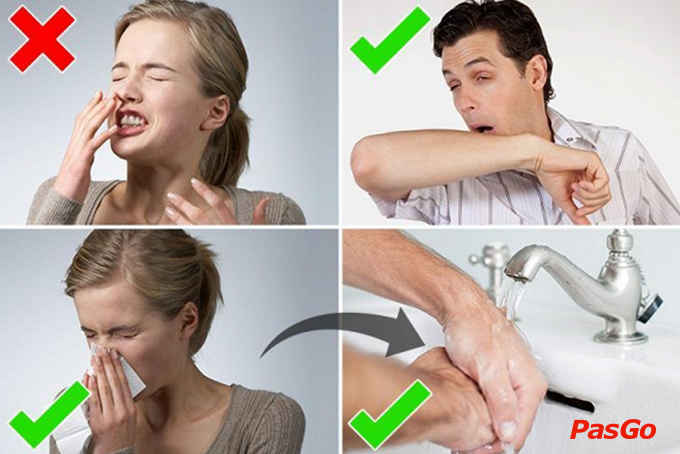 - Khi ho, hắt hơi, hãy che kín miệng và mũi bằng khăn giấy hoặc tay áo. Sau đó vứt khăn giấy vào thùng rác có nắp đậy, giặt áo sạch sẽ và phơi khô.