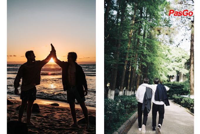 Các đôi bạn thân nam thường không chụp ảnh quá gần và ôm ấp như các bạn nữ, vì vậy kiểu chụp ảnh đứng trước sau khá là phù hợp thêm những hành động tương tác với nhau để bức ảnh trở nên đẹp hơn.