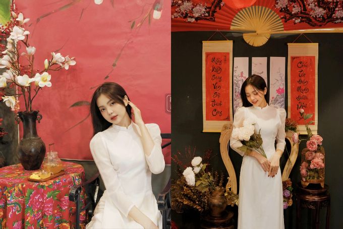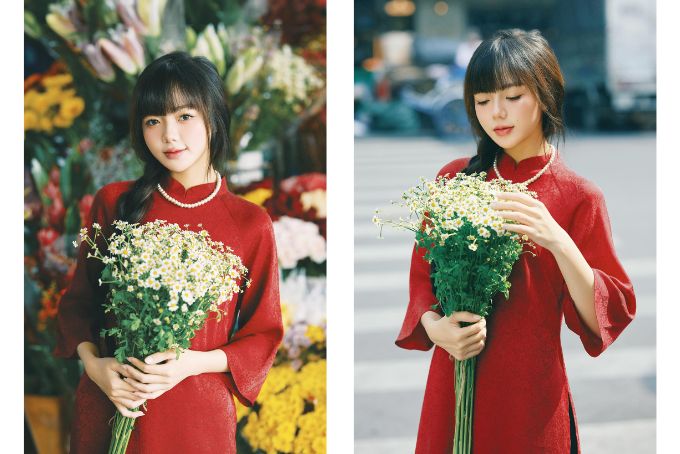 Những bó hoa tươi thắm chào năm mới chụp ảnh cùng những chiếc áo dài thướt tha tạo nên hình ảnh con gái Việt Nam đằm thắm, dịu dàng và yểu điệu. Bạn có thể chọn chụp cùng với hoa ly, hoa cúc, hoa lay ơn,... thường xuất hiện vào dịp Tết nhé.