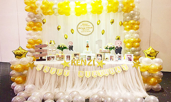 Trang trí sinh nhật bé trai kết hợp giữa gam trắng và vàng