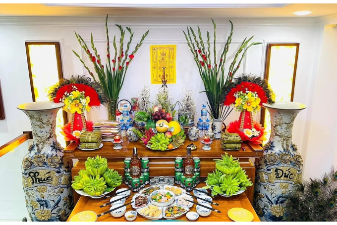 Để trang trí bàn thờ Tết ở Việt Nam không thế thiếu bánh chưng, bánh tét, hoa tươi hay mâm ngũ quả: