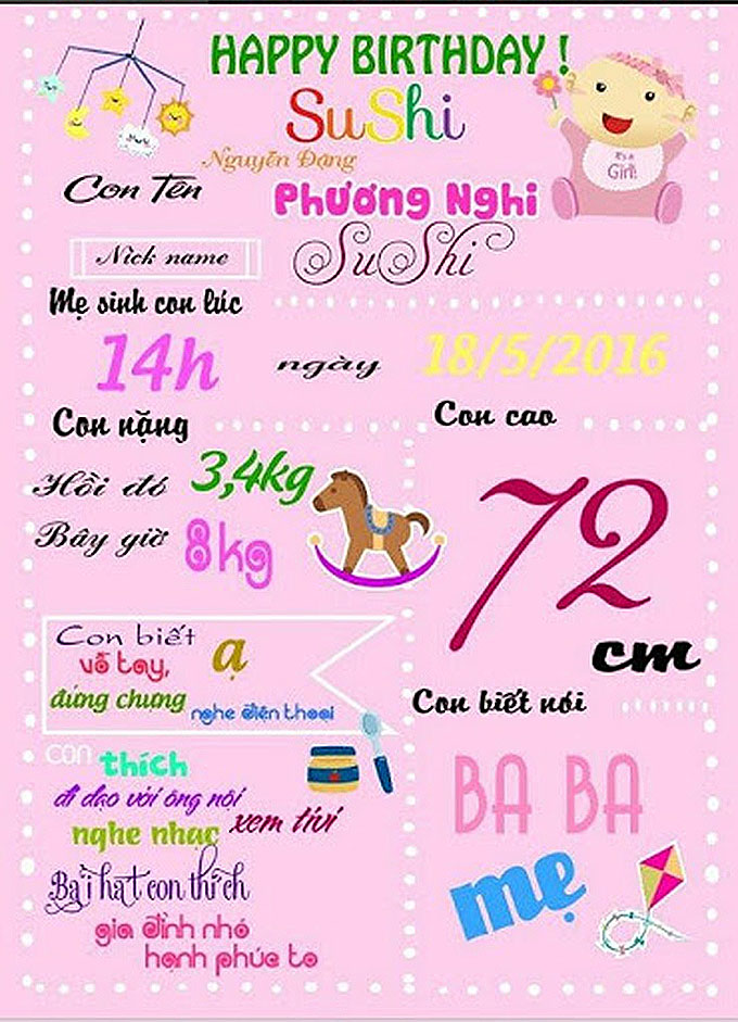 Trên bảng sẽ chắc chắn phải có 2 thông tin là tên thật (cùng với nickname) và ngày sinh nhật của bé. Ngoài ra, để chiếc bảng ấn tượng, thu hút thì bố mẹ cần liệt kê những thông tin đặc biệt khác. Có thể kể tới như: