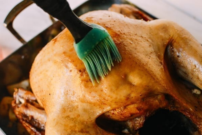 Xoa gà từ trong ra ngoài với nước sốt, đảm bảo tất cả các bề mặt đều được thoa kỹ. Đặt vỏ quýt khô vào trong khoang bụng gà cùng với phần nước sốt còn dư