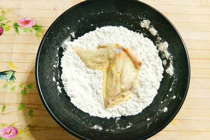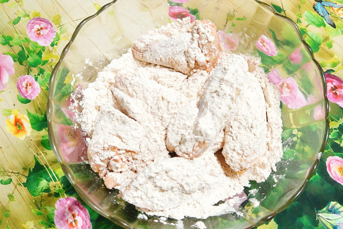 - Bỏ gà đã ướp trong tủ lạnh ra, lấy từng cánh gà cho vào hộp bột thứ 1, đậy nắp hộp lắc đều lên để bột phủ đều, rồi để cánh gà ra đĩa.
