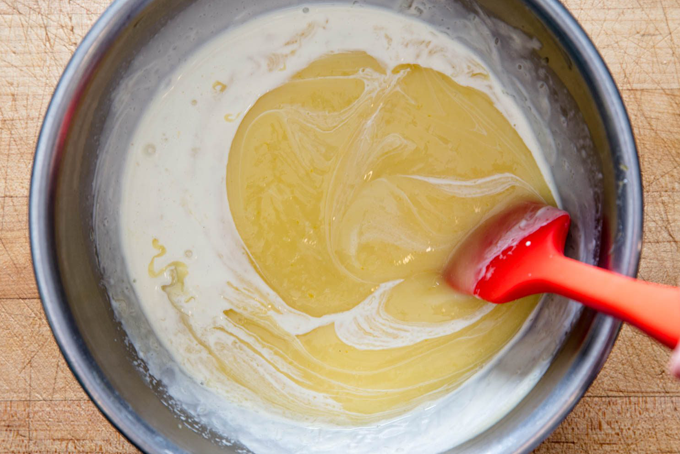- Lấy 1 cái nồi khô, cho sữa không đường + bơ đã đun chảy + 1 thìa tiêu + 1 thìa bột nghệ +2 thìa bột nêm gà + 1 thìa bột ớt vào nồi trộn đều với nhau.