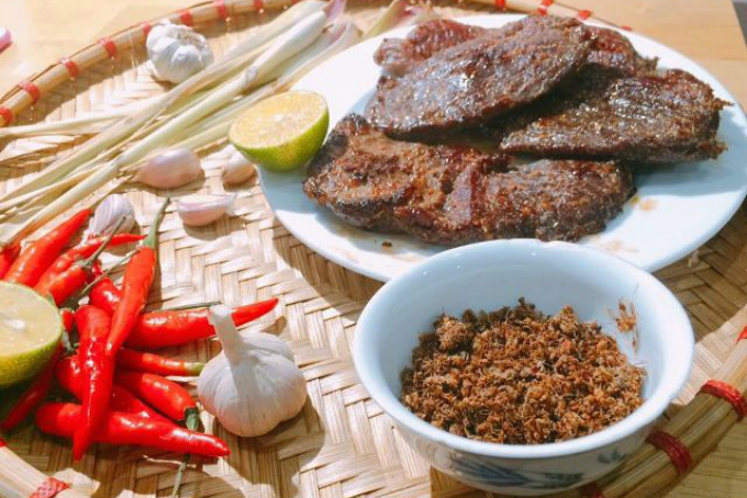 Nói về ẩm đặc sản nổi tiếng Gia Lai ắt hẳn không ít người nghĩ ngay đến món bò một nắng ăn cùng muối kiến. Món ăn độc đáo làm nên thương hiệu riêng của nền văn hóa ẩm thực Gia Lai. Bò khô muối kiến được làm từ thịt bò khô phơi nắng. Khi ăn thì nướng lại bằng bếp than hoặc lò nướng chuyên dụng. Bò khô được chấm cùng muối kiến (được làm từ con kiến, lá é, muối hạt và một số gia vị) nên người dân mới gọi món đặc sản Gia Lai này là bò khô muối kiến.