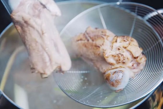 - Cho sườn và một nhánh gừng vào nồi nước đun lên để khử mùi, đến khi nước sôi thì tắt bếp, vớt sườn ra để ráo nước.