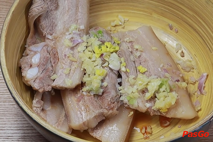 Đun sôi một nồi nước, cho vào 5gr gừng cắt lát, 2 củ hành tím cắt lát, 1 thìa cafe muối sau đó luộc thịt trong 5 phút.