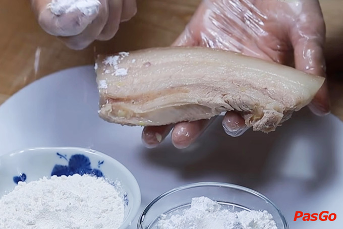 Cho 3 thìa canh bột chiên giòn, 3 thìa canh bột gạo vào đĩa lớn rồi trộn đều. Lấy từng phần thịt cho vào đĩa và áo đều bột.