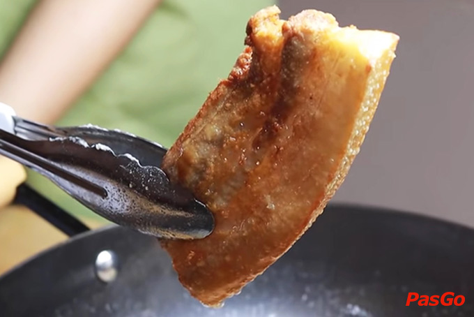 Vớt thịt ra, dùng dao khứa nhiều đường lên phần da, sau đó để ráo nước. Cách này giúp da khi chiên sẽ giòn và phồng hơn.