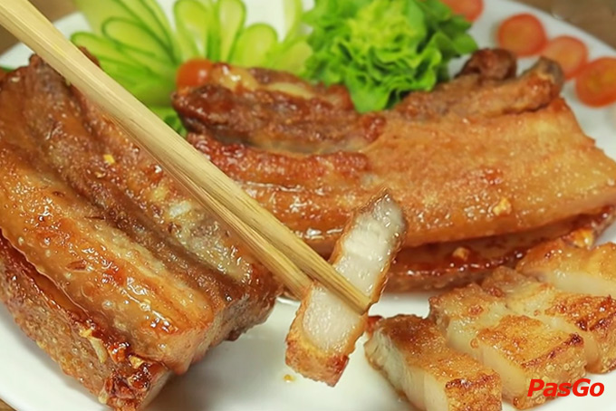 Thịt ba chỉ chiên nước mắm có lớp vỏ vàng ươm, giòn rụm, thấm đậm nước sốt mặn ngọt cùng vị bùi béo từ thịt. Ngon nhất là ăn cùng cơm nóng.