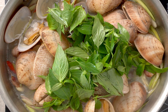 Đảo ngao và khi ngao nở hết thì cho thêm lá húng quế thái sợi vào. Cho mọi thứ vào khuấy đều rồi tắt bếp ngay.