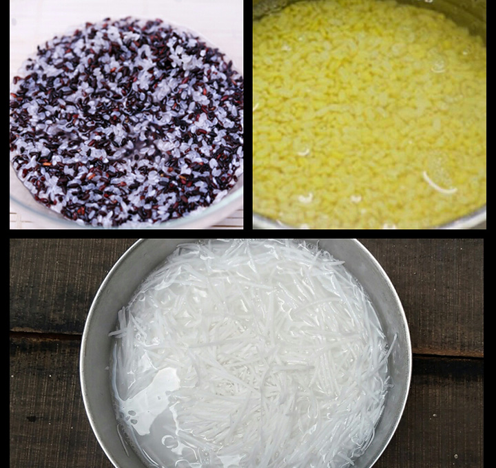 - Gạo nếp cẩm và gạo nếp cái hoa vàng trộn đều với nhau và ngâm với nước ấm khoảng 3 – 4 tiếng. Để tiết kiệm thời gian, không mất công chờ đợi thì bạn nên ngâm qua đêm. Sau đó vo sạch để ráo nước