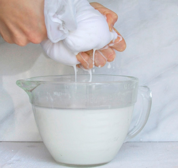 - Dừa nạo trộn với ít nước nóng sau đó bóp mạnh để lấy nước cốt.